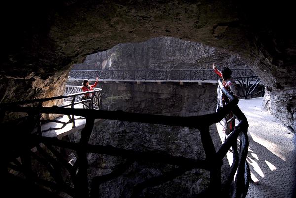 據(jù)施工人員介紹,此條棧道也是他們所修棧道中施工最難,最險(xiǎn)峻的一條.如果您還覺(jué)得不夠刺激的話(huà),在棧道的完結(jié)處的兩個(gè)懸崖之間有一條長(zhǎng)160米的懸索吊橋,同時(shí),在海拔最高點(diǎn)還有一個(gè)挑戰(zhàn)心里極限的玻璃站臺(tái),在這里,如果你能挺直腰板伸開(kāi)雙臂,那么,您就是真正的勇士了.