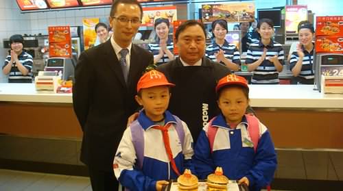 張家界市人大副主任王海生(后排右一)在麥當(dāng)勞湖南、武漢、浙江市場營運(yùn)總監(jiān)李輝的陪同下,親自制作了張家界解放路麥當(dāng)勞餐廳的第一個(gè)巨無霸漢堡,并贈(zèng)送給當(dāng)?shù)丶彝ヘ毨У暮⒆觽儭?/P>