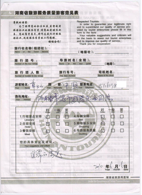 常德章燦一行8人旅游質(zhì)量回饋