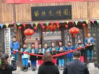 攔門酒是苗家山寨的一種古老的習(xí)俗,其中以叭咕苗寨最為盛行和最有特色。苗家娶親嫁女,親戚朋友都要上門送禮賀喜。好客的主人和賢惠大方的親朋戚友,總是要把這門喜事辦得體面熱鬧,同時也總是要借個良好的機會展示自己的富有,廣交朋友。主人把事先早已準(zhǔn)備好的包谷燒酒,請來寨子里德高望重的族老和歌師,在自家的大門口擺下大方桌,桌子上擺滿了一碗碗噴著清香的美酒。客人來時,由主管把門的族老首先唱講賀詞,然后,客人中最年長且聲望高的長者唱答謝詞。