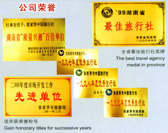 張家界市中國旅行社自1984年成立以來,至今保持年接待量、旅游收入、上繳稅費居同行業(yè)前茅的記錄,并多次被“省、市評為最佳旅行社”、“重合同守信用單位”、“質(zhì)量信得過單位”、“旅游接待優(yōu)勝單位”、“雙文明單位”。