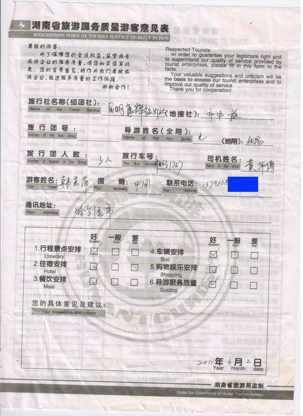 黑龍江哈爾濱韓小姐一行3人旅游質(zhì)量回饋:都很滿意!
