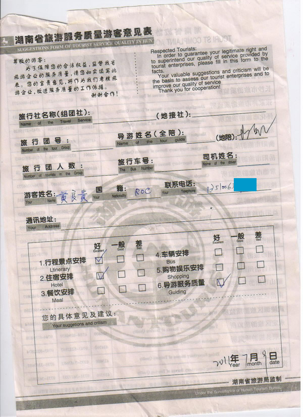 臺(tái)灣黃先生一行6人旅游質(zhì)量回饋