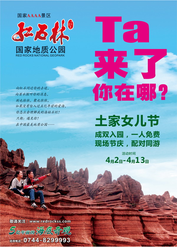 如果你是單身人士,那么你就“慘”了。在紅石林三月三土家情人節(jié)期間,是“拒絕單身入園”的哦。可親你別著急,單身又怎么了?單身還可以“脫單”的嘛!在紅石林服務(wù)中心來找一個(gè)他(她)一起入園,來場(chǎng)愛的邂逅,豈不更驚喜?同樣享受“情侶一票”的門票價(jià)格優(yōu)惠。
