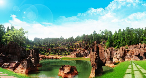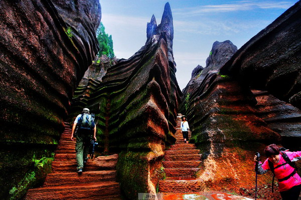 走進紅石林,猶如探進一個迷幻而又神秘的世界,景區(qū)石林奇特、峰叢怪異,石柱、河流、湖泊、暗河、瀑布、洞穴、巖溶、洼地多彩多姿、色彩斑斕、層次分明、絢麗壯觀,石林的顏色且隨季節(jié)而變:晴紅雨黑、陰轉褐紅、晨昏有別、季變色變、變幻多端、造型各異、古樸雄奇、嘆為觀止,不愧為五億年前海底世界之珍藏。