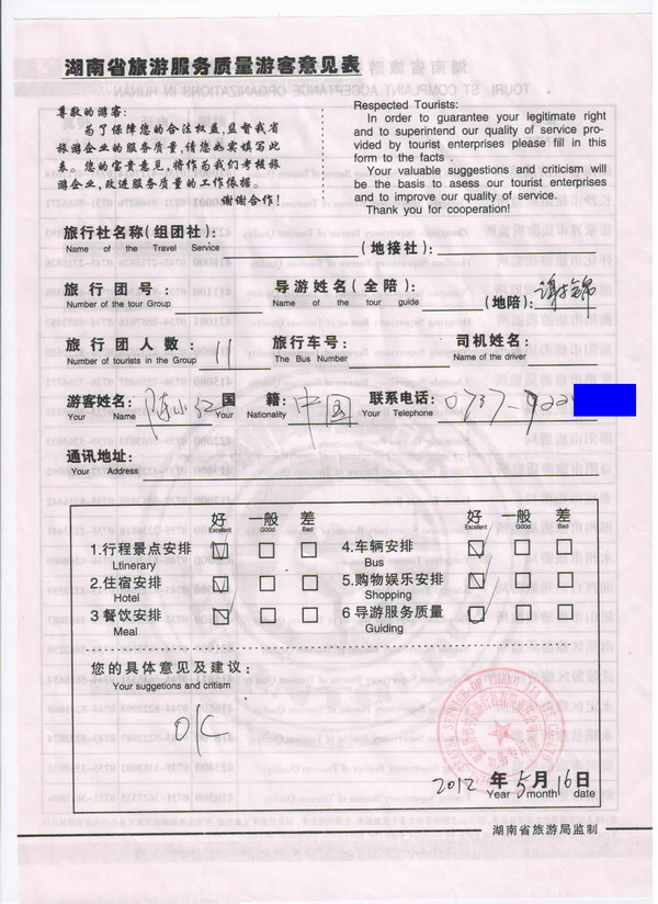 湖南陳女士一行11人旅游質(zhì)量回饋