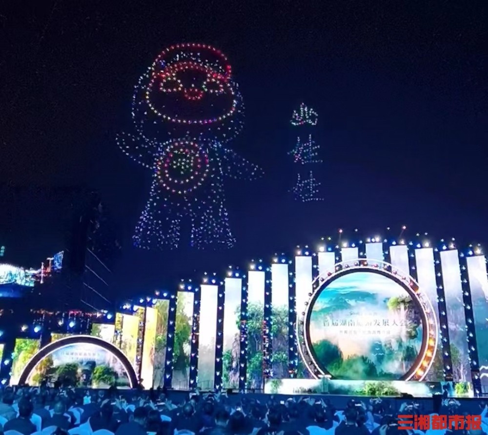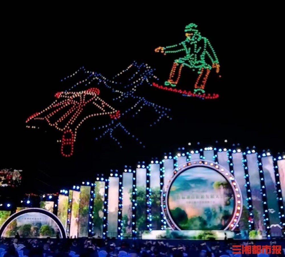 三湘都市報(bào)11月19日訊(全媒體記者 丁鵬志 王玨 見習(xí)記者 曾冠霖)11月19日晚,首屆湖南旅游發(fā)展大會(huì)開幕式暨文化旅游推介會(huì)在張家界隆重舉行,在張家界澧水河畔,電廣千機(jī)的千架無(wú)人機(jī)緩緩上升,點(diǎn)亮“仙境”張家界。隨著音樂、光影變幻慢慢起舞,為現(xiàn)場(chǎng)觀眾帶來(lái)一場(chǎng)絢麗壯觀、震撼人心的視覺與聽覺盛宴。