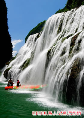 [水洞子瀑布]而鬼門關(guān)的急浪更帶著幾分野氣,它是整條漂流線中最大落差的一個(gè),同時(shí)也是最富有刺激的一段,和游人游性的情緒高漲的時(shí)刻,在有驚無險(xiǎn)的情況之下,載著滿船的浪花闖過去。闖過鬼門關(guān)我們就可以觀水洞子瀑布了,水洞子瀑布是地下水叢石壁上一個(gè)大溶洞中流出,高約70米,寬約45米,它妙在既不循岸而落,也非一瀉而注而是先順崖隙而出,時(shí)開時(shí)合,好似碎玉遍山,又如摧冰下滑。從懸崖上跌落下瀉,乘船近瀑布,又覺水從天降,那跌沖崖臺(tái)的如練垂瓊座,直落碧潭的似玉結(jié)帷簾,飄浮船中的若裙帶輕逸,水洞子瀑布既有高山流水之雅,又有飛瀉直落之雄,過水洞子瀑布到繞瀾灘頭,這繞瀾子的名字,是因?yàn)槭兜纳裢苁侥蠋r一帶的懸崖,很像秦皇所建的長(zhǎng)城吧。在長(zhǎng)城的下面圍繞著一條瓊練的玉帶,故稱繞瀾,但繞瀾的浪濤也有著不同別的灘,灘下的淺潭,清澈迷人,峭壁屏立,引人嘆奇,經(jīng)陰陽潭、黃土角等大小五道灘,便來到阻舟河,兩岸青峰陳列,使人聯(lián)想到小三峽的景色,而且三峽之處,就是滿山的翠葉隨著季節(jié)的變遷,時(shí)而綠如菌,時(shí)而紅似火。靠右岸峰頂有一組造型別致的巖石,他們?nèi)绻P如柱,如猴如僧,很像是“西游記”中的唐三藏他們師徒四人正向西天出發(fā)呢! |