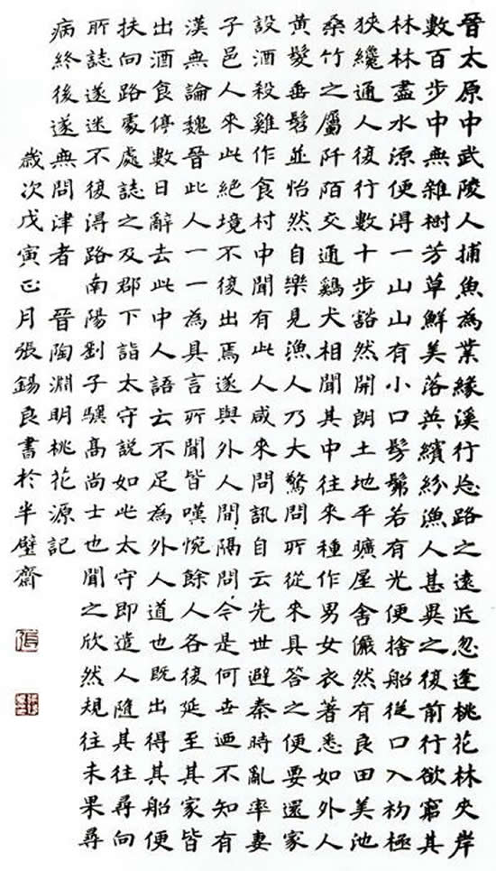 晉太元中,武陵人,捕魚(yú)為業(yè)。緣溪行,忘路之遠(yuǎn)近,忽逢桃花林。夾岸數(shù)百步,中無(wú)雜樹(shù),方草鮮美,落英繽紛。漁人甚異之,復(fù)前行,欲窮其林。林盡水源,便得一山。山有小口,仿佛若有光。便舍船從口入,初極狹,才通人。復(fù)行數(shù)十步,豁然開(kāi)朗。土地平曠,屋舍儼然,有良田美池桑竹之屬,阡陌交通,雞犬相聞。其中往來(lái)種作,男女衣著,悉如外人。黃發(fā)垂髫,并怡然自樂(lè)。見(jiàn)漁人,乃大驚,問(wèn)所從來(lái),具答之。便要還家,設(shè)酒殺雞作食。村中聞?dòng)写巳耍虂?lái)問(wèn)訊。自云先世避秦時(shí)亂,率妻子邑人,來(lái)此絕境,不復(fù)出焉,遂與外人間隔。問(wèn)今是何世,乃不知有漢,無(wú)論魏晉。此人一一為具言所聞,皆嘆惋。馀人各復(fù)延至其家,皆出酒食。停數(shù)日,辭去。此中人語(yǔ)云:“不足為外人道也”。既出,得其船,便扶向路,處處志之。及郡下,詣太守說(shuō)如此。太守即遣人隨其往,尋向所志,遂迷,不復(fù)得路。南陽(yáng)劉子驥,高尚士也,聞之,欣然規(guī)往,末果,尋病終。后遂無(wú)問(wèn)津者。