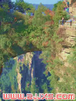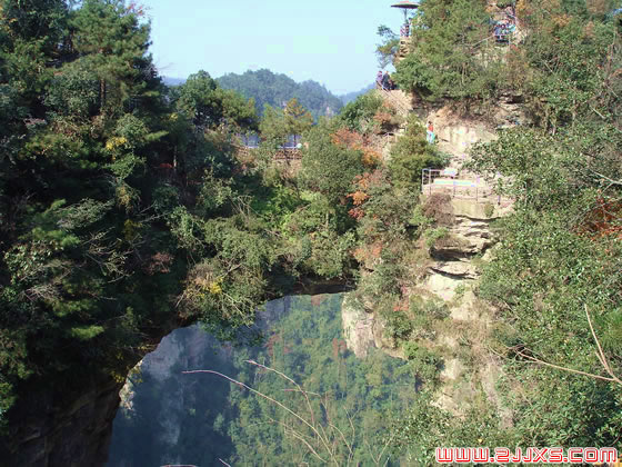 一天然石橋,位于張家界袁家界景區(qū),處砂刀溝風(fēng)景區(qū)一帶,屬張家界精華景點。大自然的鬼斧神工,將一塊厚約5米的天然石板,橫空“架”在兩座山峰之上,把東西兩峰連接。橋高350米,是張家界最高的石橋。高度、跨度和驚險均為天下罕見,故稱“天下第一橋”。橋長20米,寬僅1.5至3米不等,但較平坦,可通行人。橋上蒼松挺拔,橋下云霧蕩漾,萬丈深淵。四周懸崖絕壁,水滴飛濺。踏上橋面,使人有凌空御風(fēng)之感。手扶鐵欄桿,仰視,青峰飄渺于云靄繚繞之中;俯瞰,奇峰如筍群,巖壑深谷中陣陣煙嵐泛起,散而復(fù)聚。此景點名稱出于八十年代中到此游覽的一位美國旅行家之口。