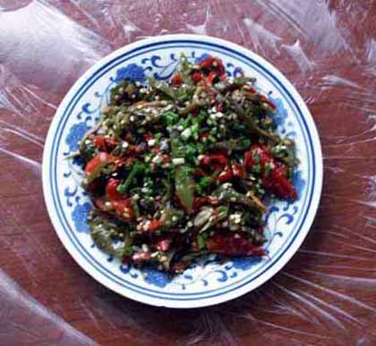 燒辣椒: 山地里,辣椒開花結(jié)果以后,苗人最喜從地里摘來青椒,放在火坑里燒燒以后,取出拍凈灰煙,放在巖缽里捶爛,然后放上食鹽,即可以吃。青椒經(jīng)過燒烤后,既去掉了大部分水氣,又褪去了辣味,吃起來十分可口開胃,特別是久病厭食者,用燒青椒拌飯可以增強食欲,故此,它間接地起著一種健身怯病作用,可稱得上苗家生活偏方。