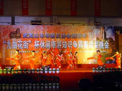 晚會由來自武夷山旅游界的人員演出了精彩的歌舞和小品節(jié)目,展示了武夷山旅游界特別是導游員隊伍的良好素質(zhì)和勃勃生氣。晚會穿插進行了 “九曲花街杯”休閑旅游知識爭霸賽的頒獎,共有18位獲獎?wù)攉@取了各等獎項,另有200位與會者獲得神秘禮物――九曲花街禮品傘,為冬雨霏霏中的武夷山水增添了不少亮色。