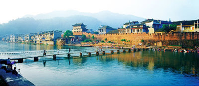 翻過山梁的時(shí)候,看到一座停留在時(shí)光里的小城,在夕陽下寧靜無語。沱江就從這座小城當(dāng)中流過。河邊有城墻、吊腳樓。河面不寬,卻清澈見底。河里長滿了碧綠的水草,隨著水流輕輕地?cái)[動(dòng)。水面上不時(shí)冒出小小的氣泡,那是魚蝦在歡快地游玩。捕魚的、游覽的小船來來往往,各得其所。