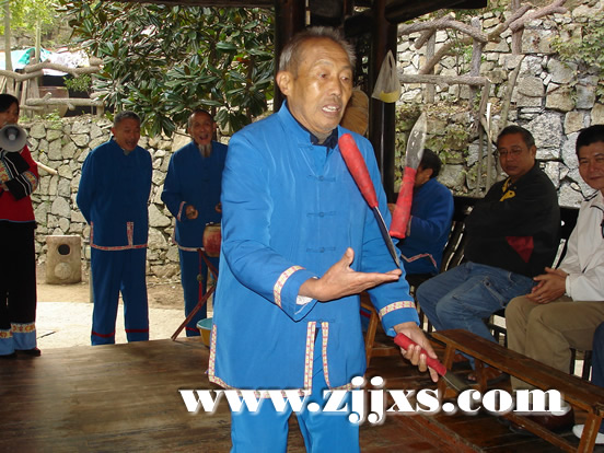 三棒鼓,唐代稱三仗鼓,約于明代傳入本境,并逐漸成為群眾喜聞樂見的民間藝術(shù)形式。每年春節(jié),藝人們結(jié)伴走村串寨拜年,表現(xiàn)對象不分貧富,戶戶必到。如遇貧寒之家,表演者將別家贈(zèng)送的禮品相送,意在人人過節(jié)歡喜。充分體現(xiàn)出土家人熱情好客,心地善良的民族性格。對加強(qiáng)民族間團(tuán)結(jié)有一定的作用。三棒鼓 通常由三至五人組成,一人擊鼓唱詞,一人鑼鼓配樂,一人;ò;ò羧L一尺,舞者左右 各執(zhí)一根,將另一根拋在空中,左右開弓,擊打空中花棒使之不落地。也有以刀代棒,以五刀代三棒的技藝。鋼刀在空中歡跳,銀光閃閃,左右穿梭。技藝高強(qiáng)者,突然把刀拋得及高,來一個(gè)騰空飛腳,轉(zhuǎn)身外擺,繼續(xù)接刀上拋,令人眼花繚亂,不禁稱絕。打三棒鼓,通常有“鬧春耕”、“收割打場”、“慶豐收”、“拜年節(jié)”四套,分“鯉魚跳龍門”、“玉女穿梭”、“板巖漂灘”等項(xiàng)目。打三棒鼓技巧性強(qiáng),表演時(shí)需高度集中,用力適當(dāng),貫通一氣,并與演唱者默契配合。