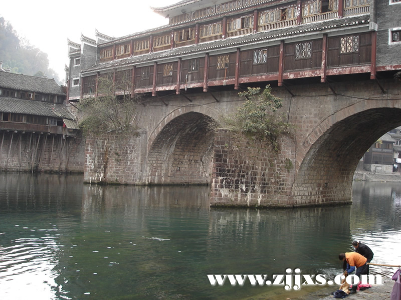 這座橋始建于明洪武初年,頗信風(fēng)水的鳳凰人都說,這座橋斬?cái)嗟氖且粭l龍頸,令一條巨龍身首異處。怪只怪那位和尚出生的安徽小子朱元璋,聽信一位從昆侖山開始追索一支龍脈,經(jīng)云貴高原來到五寨司城的陰陽先生的讒言,說這兒屏立南郊?xì)鈩莘欠驳哪先A山和與之一脈相承一頭扎入沱江的奇峰,就是他要尋找的龍頭。并由此推斷出總有一天這地方會有人出來問鼎中原,真命天子將出。那位朱皇帝豈能允許邊遠(yuǎn)的鳳凰有他潛在的對頭?于是朱筆一勾,龍頸被斬,鳳凰風(fēng)水遭毀滅性破壞,鳳凰再也出不來皇帝了。