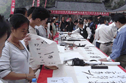 點睛天門:文人騷客聚天門,詩詞歌賦競傳奇 天門洞下,清風習習,文人騷客,宣紙筆墨,描繪出了一首首絕妙佳句;顒优e辦以來,一直受全國乃至全世界書法愛好者的青睞,不同的國籍,不同的語言,相同的感慨,目前,由張家界八大書法家共同執(zhí)筆寫的一幅長25米的“天門十六峰”成為了眾人驚嘆的佳作。