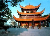 岳陽樓,東倚巴陵山,西臨洞庭湖,雄踞岳陽城西門之上,氣勢非常雄偉,與武昌黃鶴樓,南昌滕王閣并稱為中國江南三 大名樓,歷代文人墨客多會于此,留下了不少千古名篇。據(jù)傳,岳陽樓最初是供據(jù)守城門的衛(wèi)兵憩息和了望的譙樓。三國時,東吳大將魯肅在岳陽操練水兵,將其改建為閱軍樓。唐開元四年(公元716年),中書令張說謫守岳陽,對此樓再次進行了擴建,名南樓,又叫岳陽樓。宋慶歷四年(公元1004年),滕子京謫守巴陵郡,重修岳陽樓,并請自己的好友,著名文學家范仲淹作《岳陽樓記》,寫下了"先天下之憂而憂,后天下之樂而樂"的名句,岳陽樓更是名揚天下。在迄今為止的1700多年中,岳陽樓歷盡滄桑,幾經(jīng)水淹、火燔、雷擊、兵災,但屢毀屢修,古樸之貌代代相襲,始終保持良好。岳陽樓的建筑藝術(shù),真可謂巧奪天工。該樓主樓高19米,為"四柱"、"三層、飛檐、純木"建筑。中間以四根楠木大柱從地到頂,承荷大部分重力,再用12根金柱作為內(nèi)圍,支撐二樓,外圍繞以20根檐柱,彼此牽制,結(jié)為整體,飛檐與屋頂用傘型架傳載負荷。三樓用"如意斗拱"、層疊相襯,拱托樓頂。全樓無一磚石,全用木料構(gòu)成。閂縫對榫,結(jié)構(gòu)嚴 整,工藝精巧,造型莊重。飛檐、樓頂均蓋黃色琉璃筒瓦,飛檐尖端飾以龍鳳,昂首翹尾即欲騰飛。其三樓樓頂外貌酷似古代將軍頭盔,俗稱盔頂,為我國古代建筑中所罕見