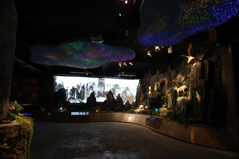 展廳右側(cè)為一幅張家界全景水墨長(zhǎng)卷,以多媒體投影的云霧輔助全景畫(huà)的形式為游客描繪了一幅奇峰競(jìng)秀、奇花爭(zhēng)妍、云煙繚繞、溪水潺潺、珍禽競(jìng)翔、鳥(niǎo)啼蟬鳴的張家界。畫(huà)里的山石自然延伸到了畫(huà)外,一些珍禽異獸的標(biāo)本從巖石的縫隙中探出身來(lái),在燈光的襯托下既靈動(dòng)、神秘又切合主題。