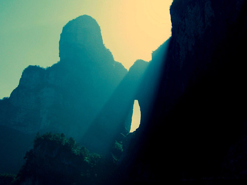 順勢而上,可見幾座遠(yuǎn)峰迎面而來,外形如根根箭桿,共有九座相連,傳說是后羿射日的九根箭桿所化而成.美麗的傳說和神奇的景觀,融匯成了天門山的雄偉,奇俊和妖嬈,充盈著整條通天大道的旅程,最終讓人感受到的則是天門山的慧然靈氣!