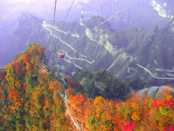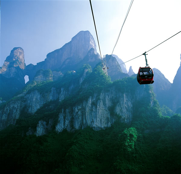 隨通天大道盤旋而上, 可以領(lǐng)略到天門山索道與藍(lán)天白云相映成趣的蔚蔚壯觀和奇絕高險,還能在經(jīng)過索道中站房時感受大自然的奇妙和飄然,那座頗似馱滿元寶的烏龜?shù)纳椒褰凶鼋瘕旕W元寶.再收回遠(yuǎn)眺的目光來看近前,有一道天然畫屏橫在面前,這就是天門畫屏了.仔細(xì)觀望認(rèn)真度量之后會覺得整座天門山就如一幅雄踞于天際的妙筆丹青.綠,是生機盎然的氣息;白,是流溢飛揚的風(fēng)采;黑,是雄奇崔巍的俊朗;氤氳的,則是如竺如籟的仙韻.一任斗轉(zhuǎn)星移,風(fēng)云變幻,天門山始終以壁立萬傾的雄偉粗獷揮灑著“張家界之魂”的磅礴和雄渾.