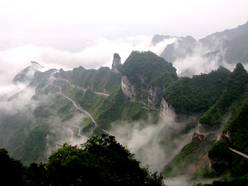 通天大道以進(jìn)山時的標(biāo)志門為起點,一直通達(dá)天門洞腳下,全長 10.77 公里 ,但就在這么短的距離里,它的海拔卻從 200 米 急劇提升到了 1300 米 ,大道兩側(cè)絕壁千仞,空谷幽深, 180 度的急彎此消而彼長,層層疊起,“ 堪稱天下第一公路奇觀 ”.中國書法協(xié)會常務(wù)副會長沈鵬先生走過通天大道后欣然為其題字“曲道通天”,字體遒勁挺拔,與通天大道的奇絕天下相融為一體.