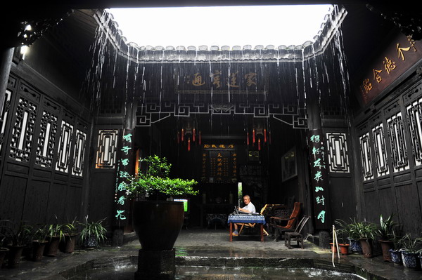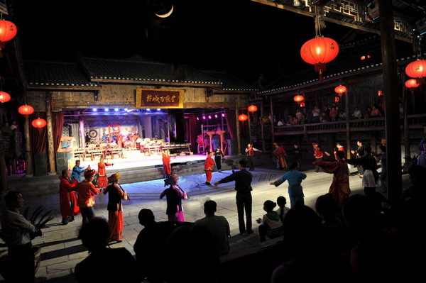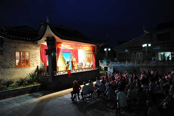 沒走幾步,一支帶著童音的歌聲,從一座木板庭院里傳出,幽雅,張揚(yáng),我們循聲走進(jìn)這棟老屋,庭院里居然是一處表演場(chǎng),一個(gè)小姑娘握著話筒在舞臺(tái)上一邊歌唱,一邊表演。這邊觀眾臺(tái)前端莊地坐著幾位帶有藝術(shù)氣質(zhì)的中年人,他們?cè)诩?xì)語,像是在評(píng)判著那個(gè)姑娘的姿態(tài)和演唱。