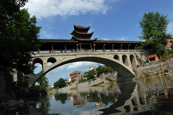 我們順著江岸上行,遠(yuǎn)遠(yuǎn)地看見一座飛架東西的石拱橋橫跨江岸。那定是傳說中的三王閣風(fēng)雨橋了。盡管我難以尋找那些傳說中的故事,但是,我知道,這座風(fēng)雨橋見證古城的滄桑變化。