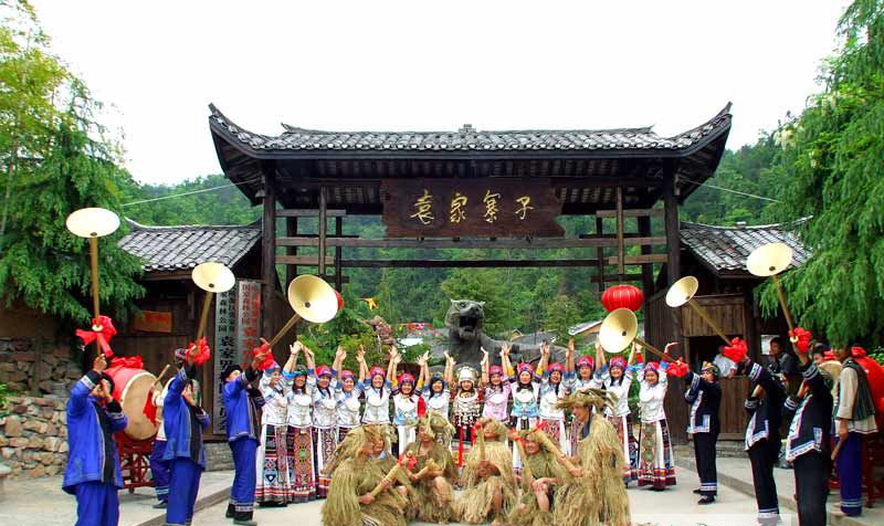 在張家界264平方公里石英砂巖絕壁頂上、3103根神秘山峰之巔至今唯一保存著一座土家山寨----袁家寨子。這里居住著一群喝虎乳長(zhǎng)大的土家后裔,他們至今還沿襲200年前的后產(chǎn)、生活方式。這座寨子構(gòu)建獨(dú)特,是按照動(dòng)物形體建造的仿生建筑。寨民靠耕種“空中田園”為計(jì),為游人現(xiàn)場(chǎng)表演碾、榨、磨、碓、織等原始傳統(tǒng)手藝;通過(guò)唱、跳、哭、咒、符等另類的習(xí)俗和神秘的信仰,演繹著高山土著民的“人、神、情”秘訣。